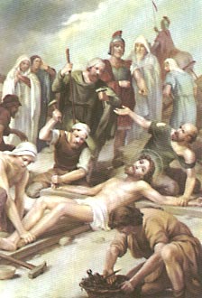 Se cumplen las palabras del profeta. Comienza la ejecución. Los golpes de los soldados aplastan contra el madero de la Cruz las manos y los pies del Condenado. En las muñecas de las manos, los clavos penetran con fuerza. Esos clavos sostendrán al Condenado entre los indescriptibles tormentos de la Agonía. En su Cuerpo y en su espíritu de gran sensibilidad, Cristo sufre lo indecible. Junto a Él son crucificados dos verdaderos malhechores, uno a su derecha y el otro a su izquierda. Se cumple así la profecía: "con los rebeldes fue contado" (Is 53,12).